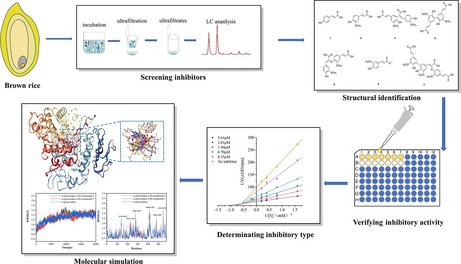 研究人员采用亲和超滤结合高效液相色谱法从糙米结合态酚类提取物(BRBPE)鉴定出7种酚类化合物:3种单体(对香豆酸、阿魏酸、阿魏酸甲酯)、3种二聚体(8-5’、5-5’、8-O-4’二阿魏酸)和1种三聚体(5-5’/8-O-4’脱氢三阿魏酸)。它们对α-葡萄糖苷酶均有抑制作用,其中5-5’/8-O-4’脱氢三阿魏酸和5-5’二阿魏酸的抑制活性最好。酶动力学分析表明,这7种抑制剂的抑制机制包括竞争性、非竞争性和混合方式。