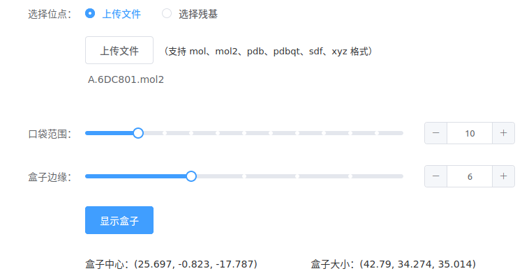 - 使用【准备受体三维结构】步骤中生成的包含口袋位点信息的共晶配体文件定义对接口袋