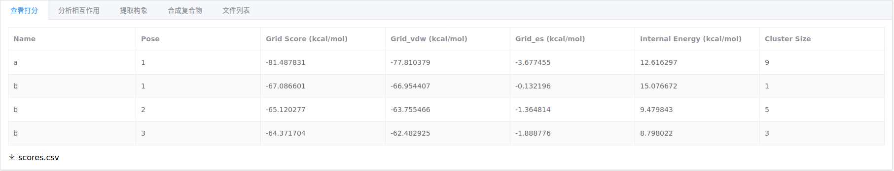 Grid Score:对接打分,该数值越小表示结合力越强,因此,Pose 1总是最强的。Grid Score由