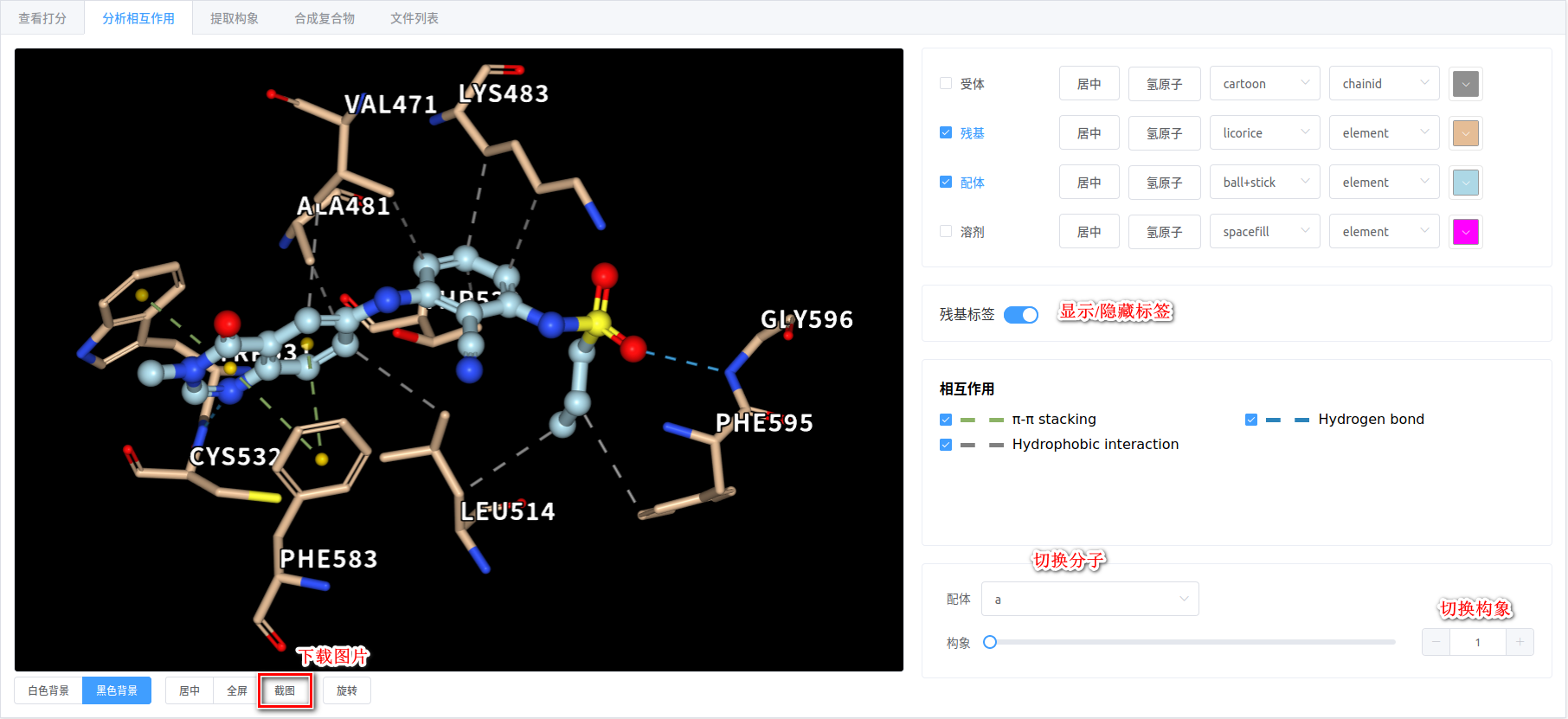 - 右侧可调整视图样式,右下角可切换化合物和构象;