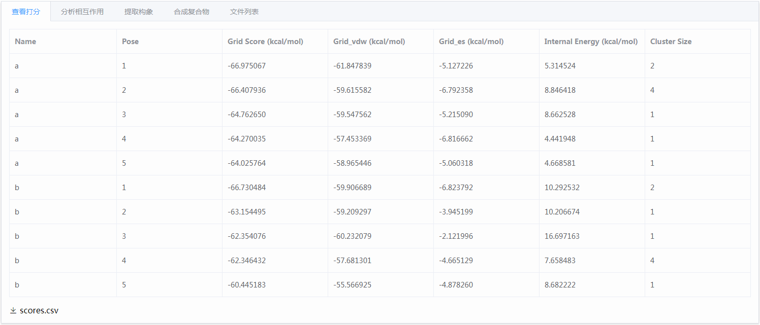 查看对接打分,下载数据文件scores.csv;