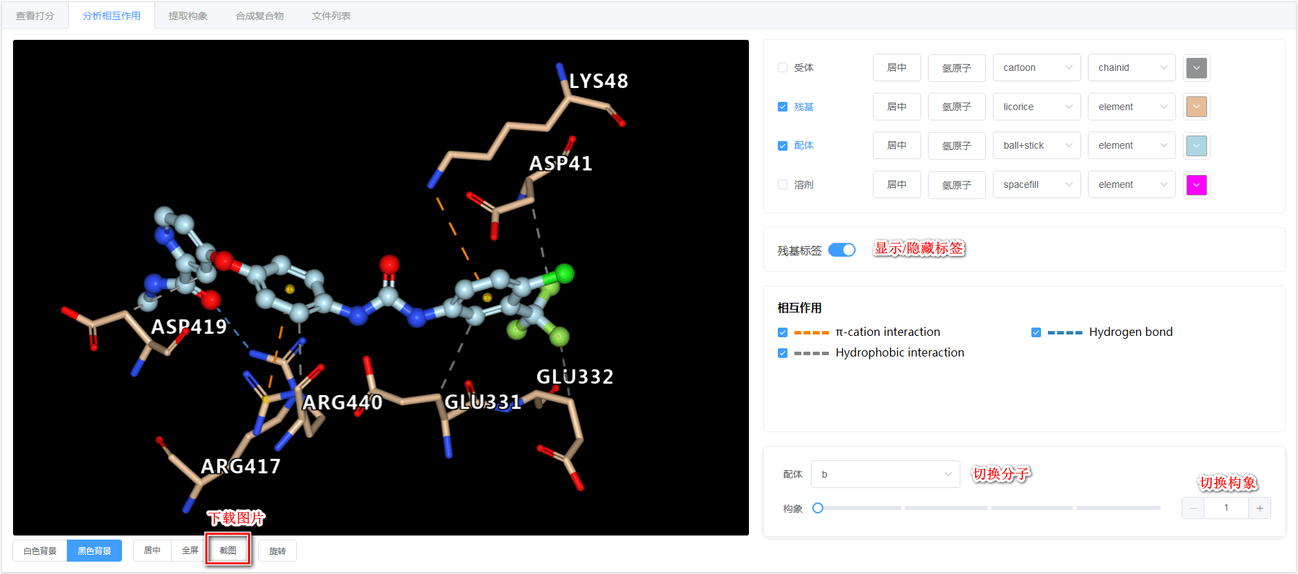 查看相互作用,调整视图,点击【截图】下载图片;