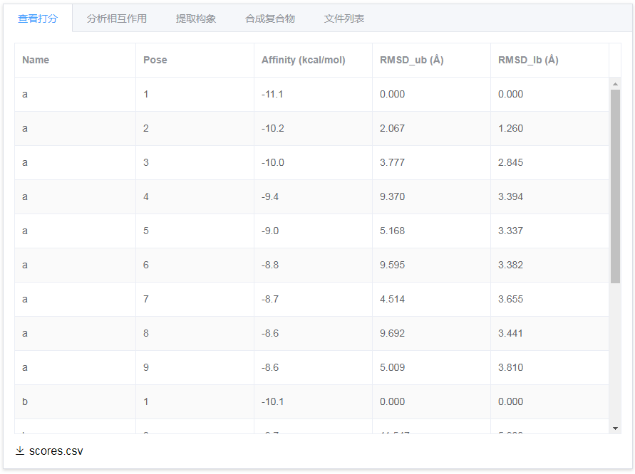 查看对接打分,下载scores.csv文件;