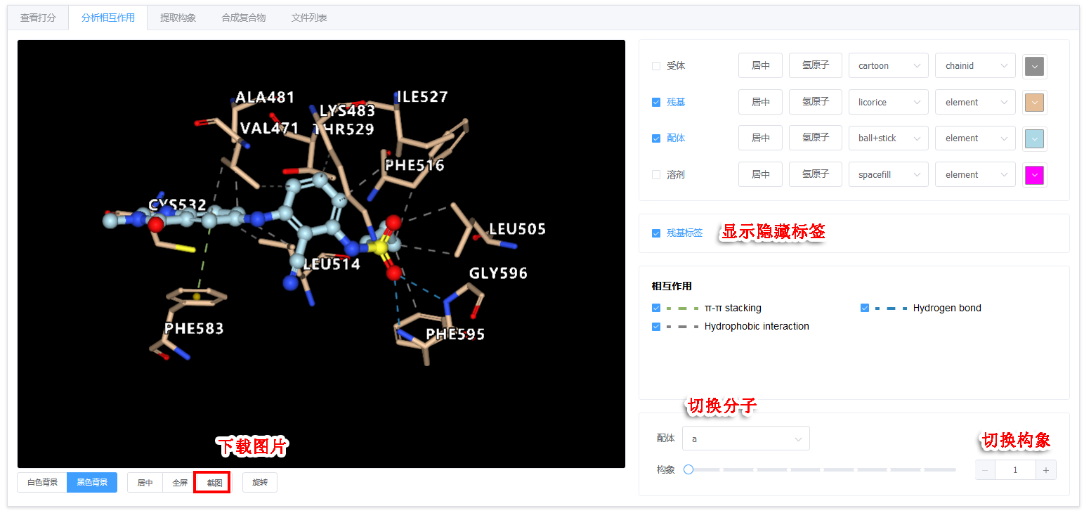 查看相互作用,调整视图,点击【截图】下载图片;